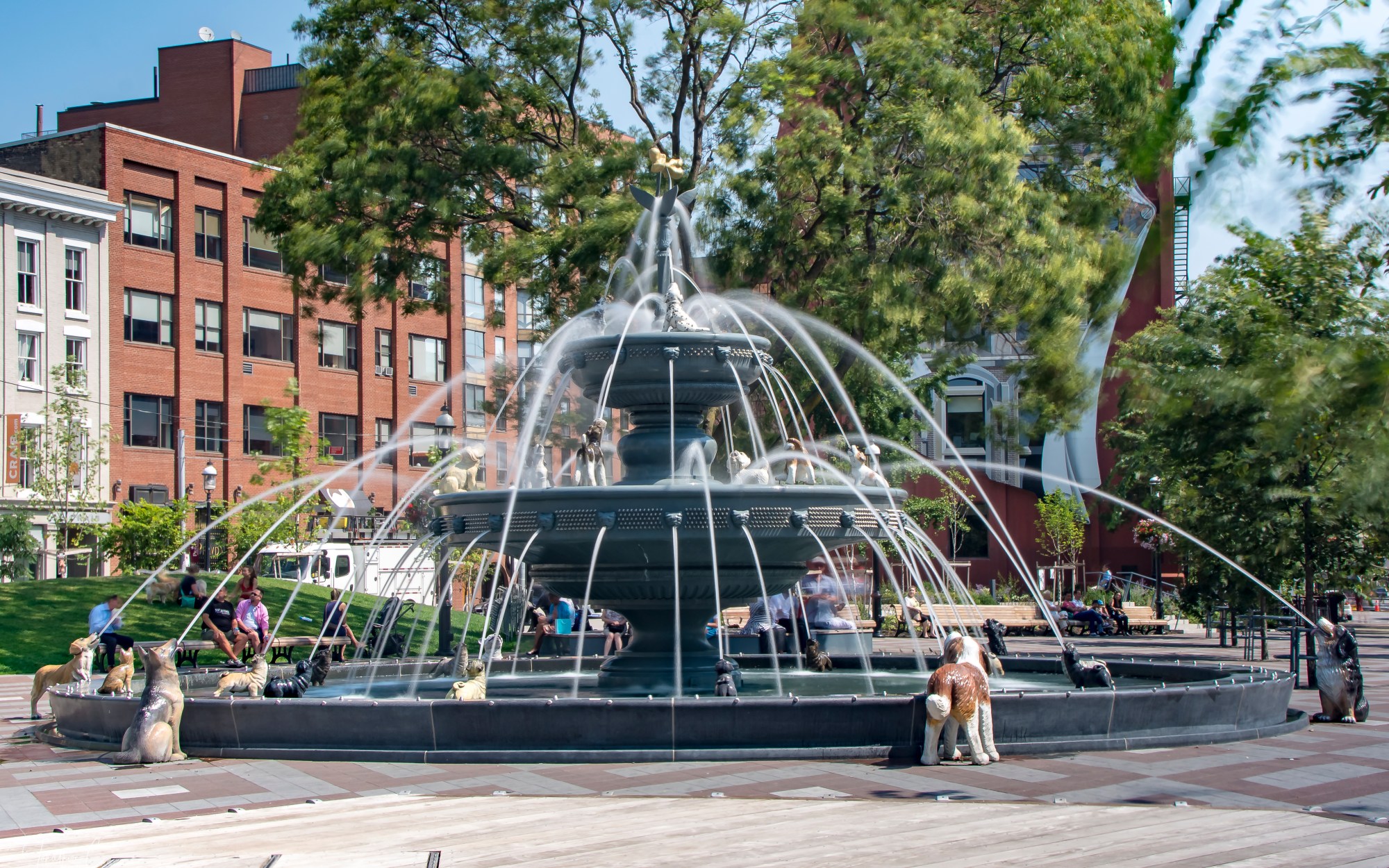 The positioning of the fountain also affords photographers the opportunity to create a variety of shots with different backgrounds that seem to transform the location while maintaining the fountain in the foreground. Different backgrounds range from historical to modern glass buildings to trees and the Flatiron Mural.