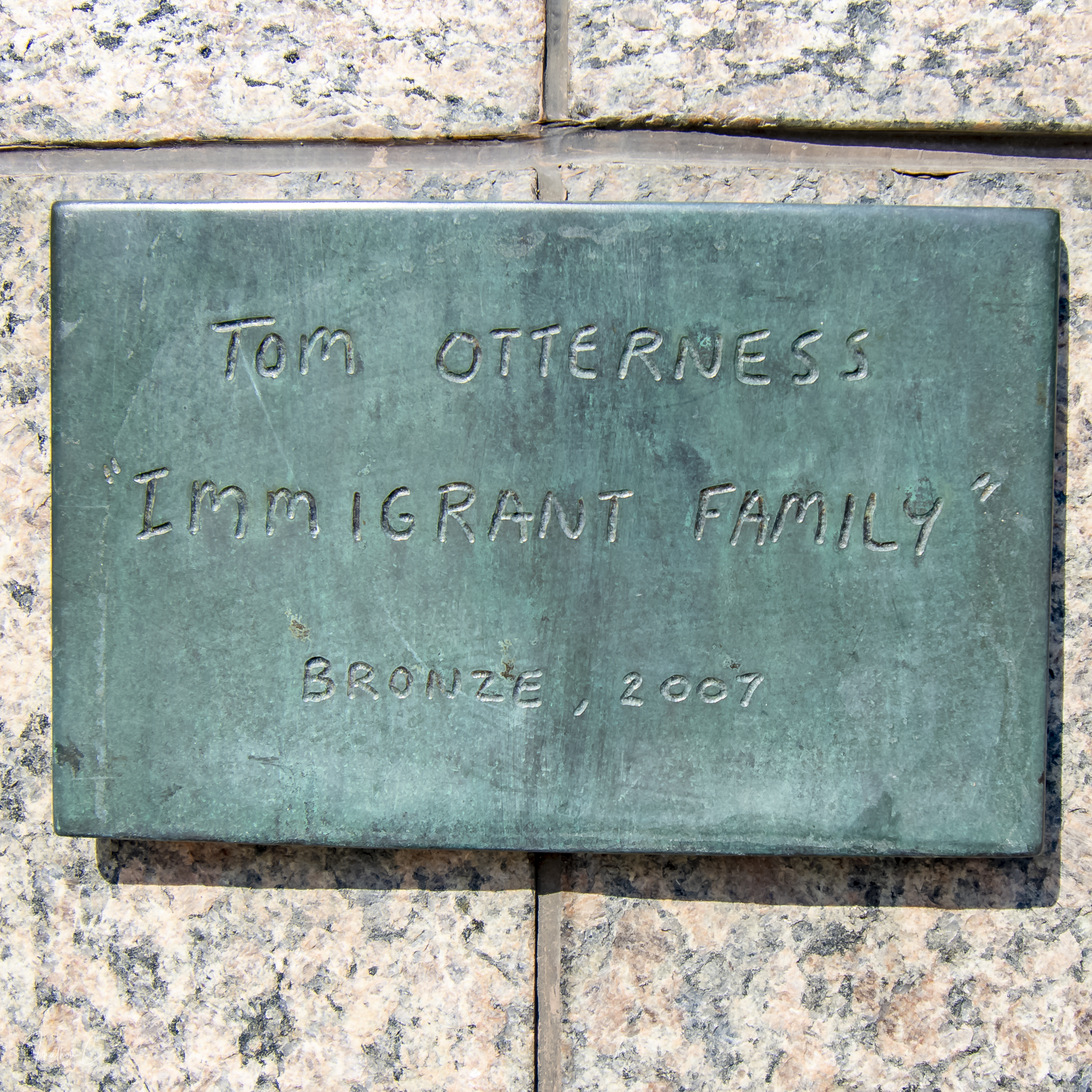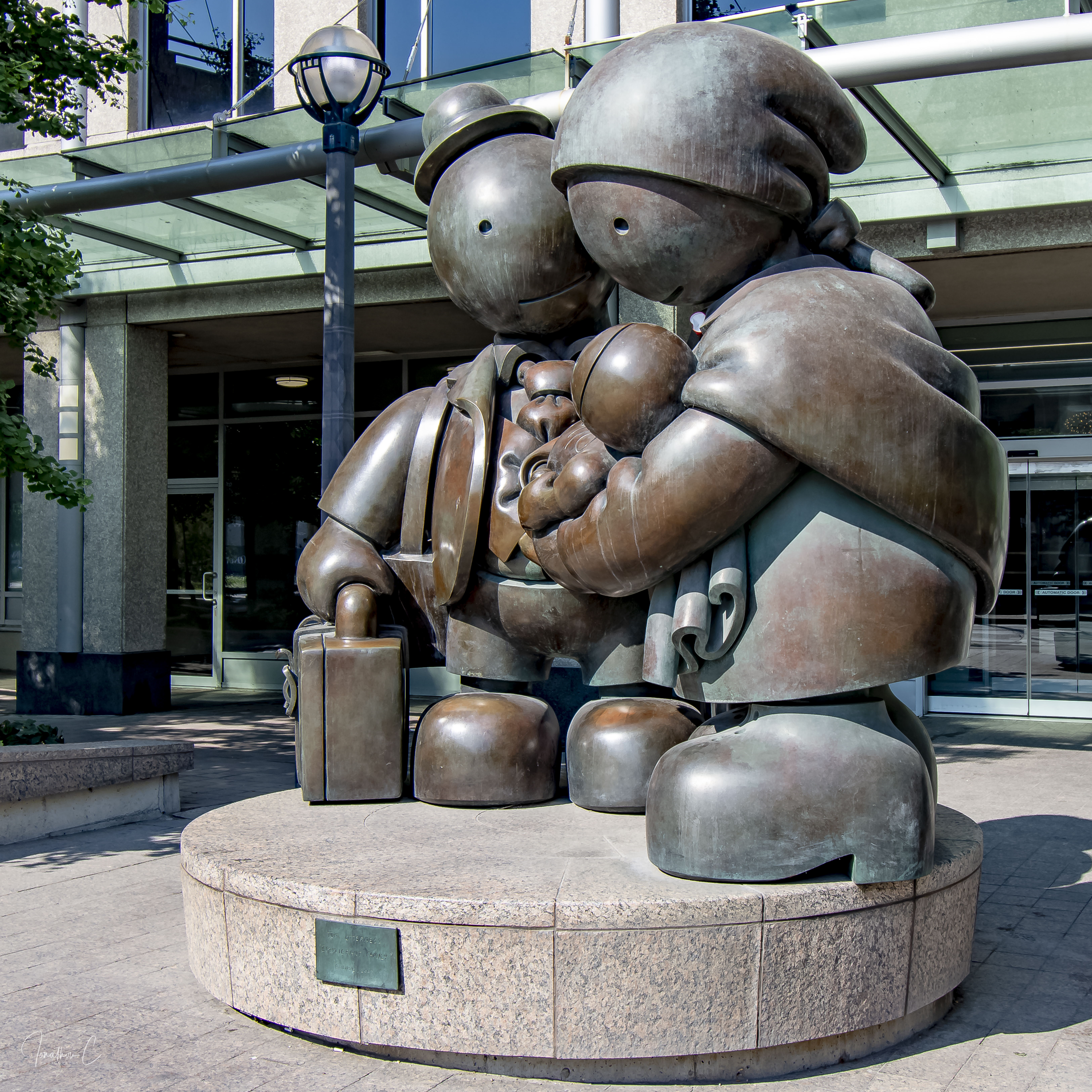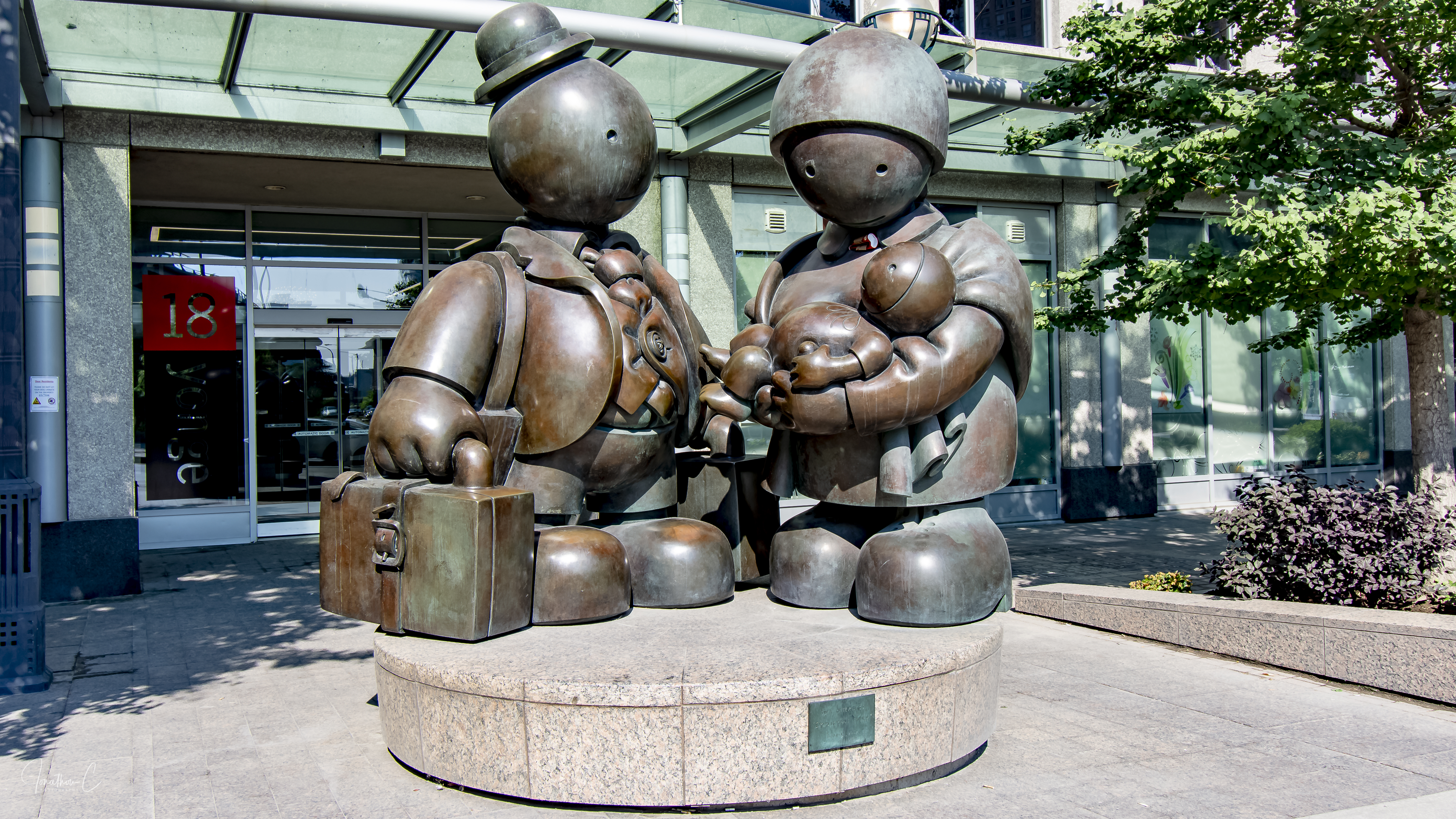 The sculpture shows a family – husband, wife and infant child – with the child being cradled in the mother’s arms – with suitcases in tow – arriving in the new country and looking forward to all the hope and promise a new beginning brings. Many feel that the piece seems to be almost the perfect way to welcome people to the building where it is situated.