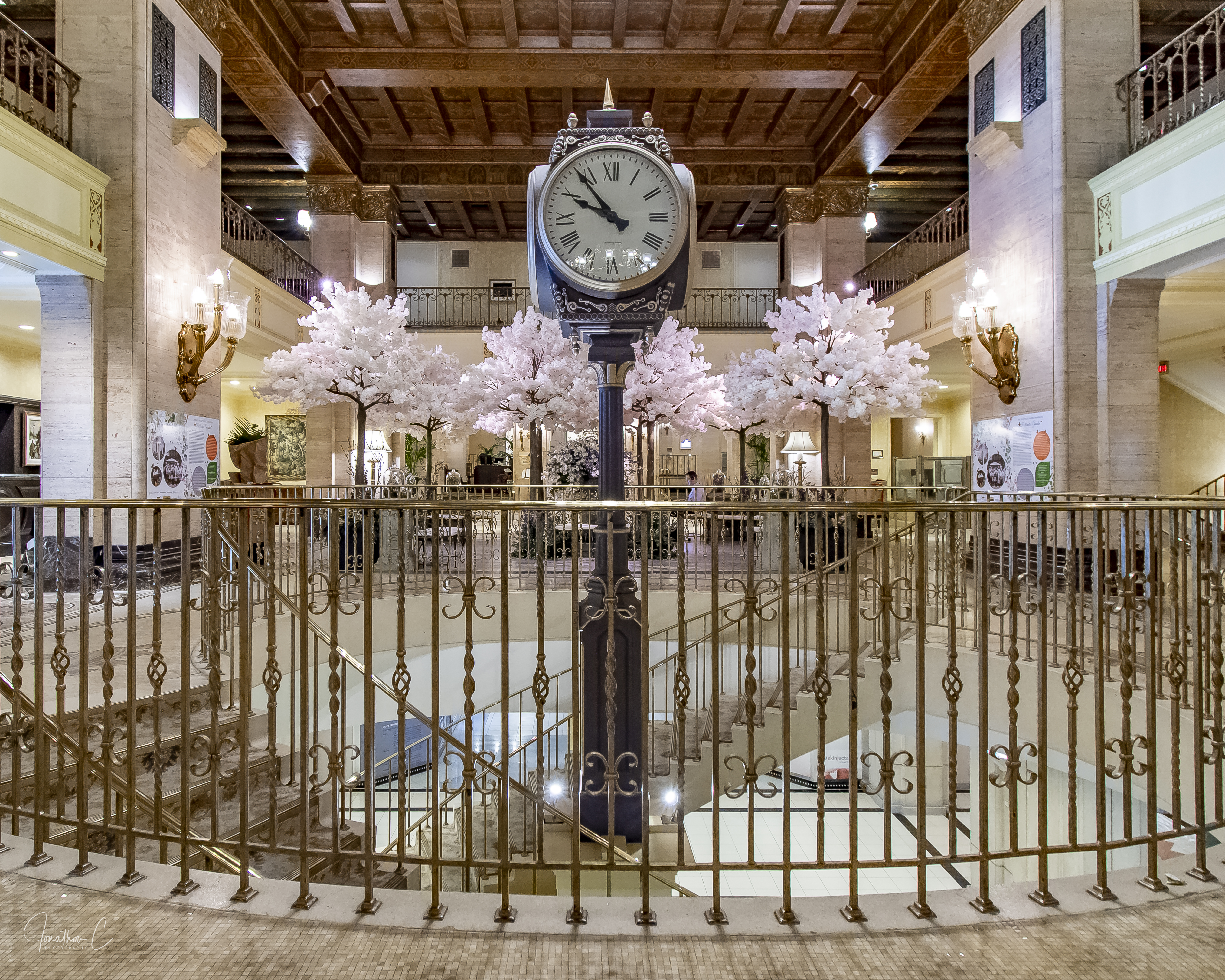 This clock is located just inside the main doors in the middle of the lobby of the Royal York Hotel. It is the centerpiece of a staircase leading to and from the lower level of the hotel.