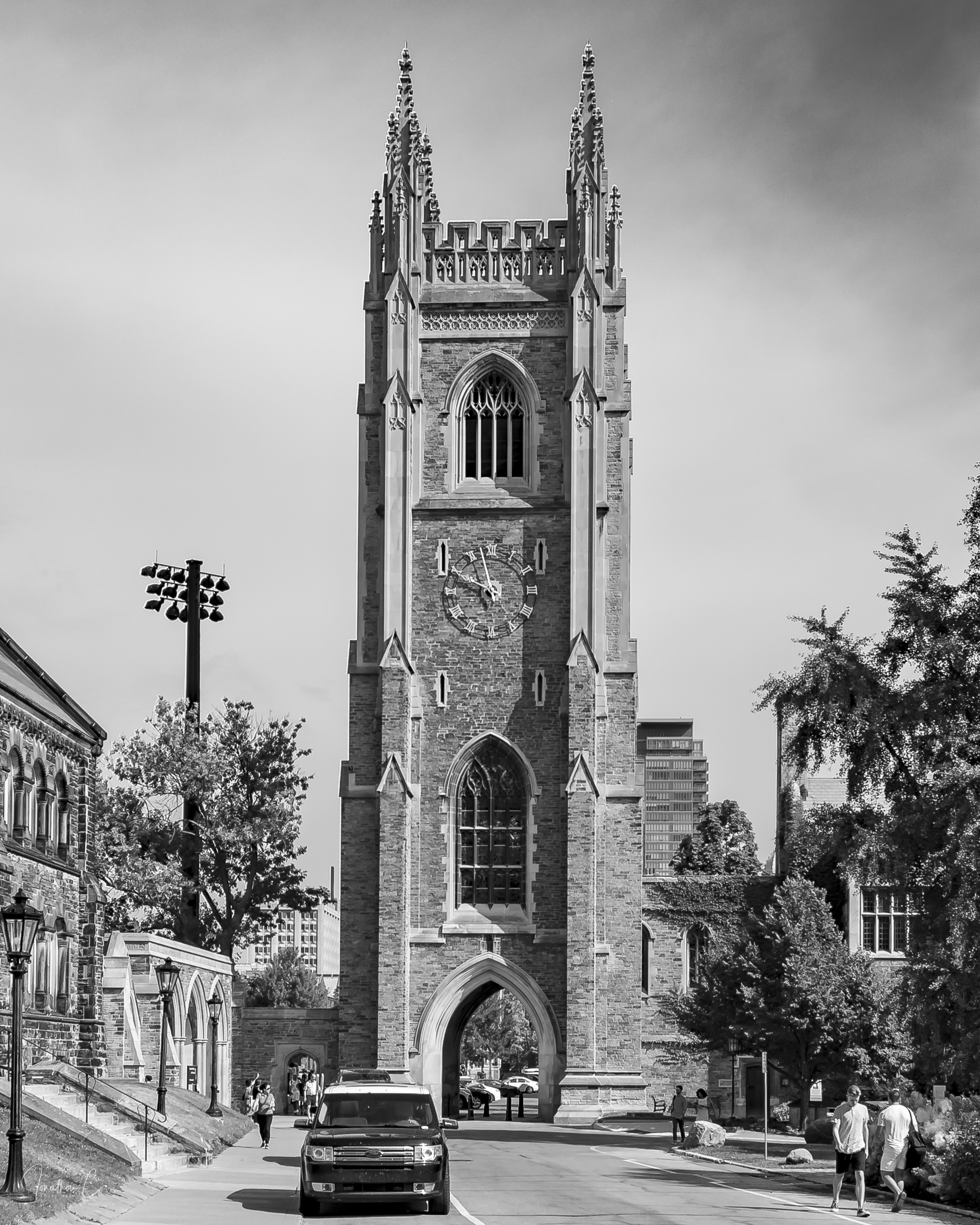 The Soldiers’ Tower at Hart House. This 143-foot tall structure is a memorial to members of the University of Toronto who gave their lives while on active service. It was built from 1923-1924 using funds raised by U of T Alumni Association. The clock itself was purchased in 1927.